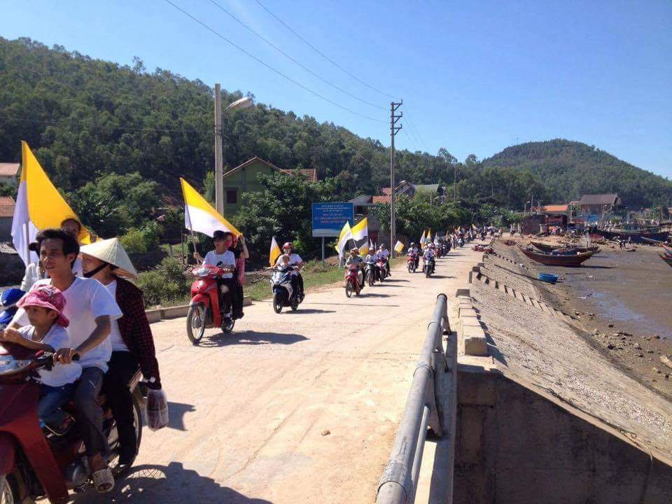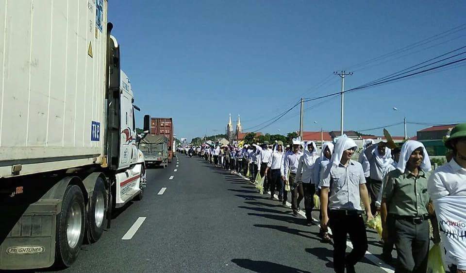 - Những đoàn xuống đường đã đi dọc theo quốc lộ 1A và vòng xuống biển hàng chục km, với các linh mục dẫn đầu. Rất nhìu an ninh, CSCĐ có mặt nhưng cũng... đứng đường rất... ôn hòa