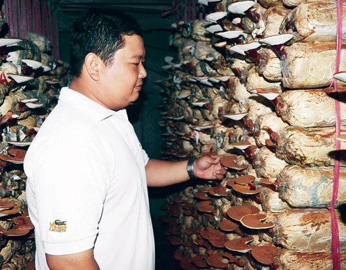 Tham quan các trang trại của anh Điền, chúng tôi nhận thấy nấm linh chi phát triển rất đều, đẹp mắt. Anh Điền cho biết, ngoài thời gian làm việc tại UBND phường, anh đều dành thời gian vào việc nghiên cứu, sản xuất các loại sản phẩm nông nghiệp “độc”, lạ trên.
