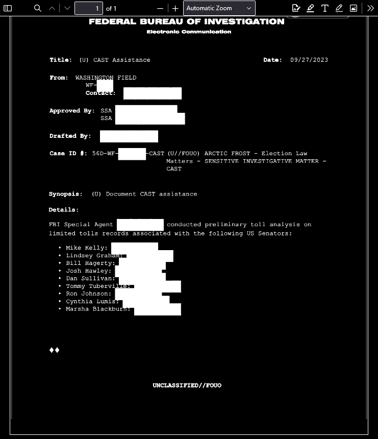 The document, dated Sept. 27, 2023, says that an FBI special agent — whose name is redacted — conducted “preliminary toll analysis” on the phone records of Sens. Lindsey Graham (S.C.), Bill Hagerty (Tenn.), Josh Hawley (Mo.), Dan Sullivan (Alaska), Tommy Tuberville (Ala.), Ron Johnson (Wisc.), Cynthia Lummis (Wy.) and Marsha Blackburn (Tenn.), along with Rep. Mike Kelly (Pa.).