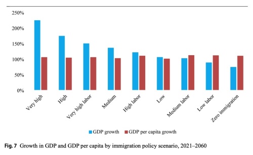 In fact, the option of zero immigration generates higher per-capita growth than the GDP-boosting option of mass family migration, according to the study.